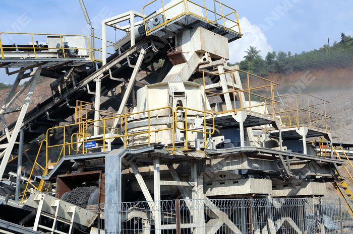 1. 0-40mm的骨料經(jīng)懸掛式給料機(jī),膠帶輸送機(jī)輸送至VSI沖擊式制砂機(jī)進(jìn)行破碎,沖擊破出來(lái)的物料上一個(gè)二層振動(dòng)篩進(jìn)行篩分;